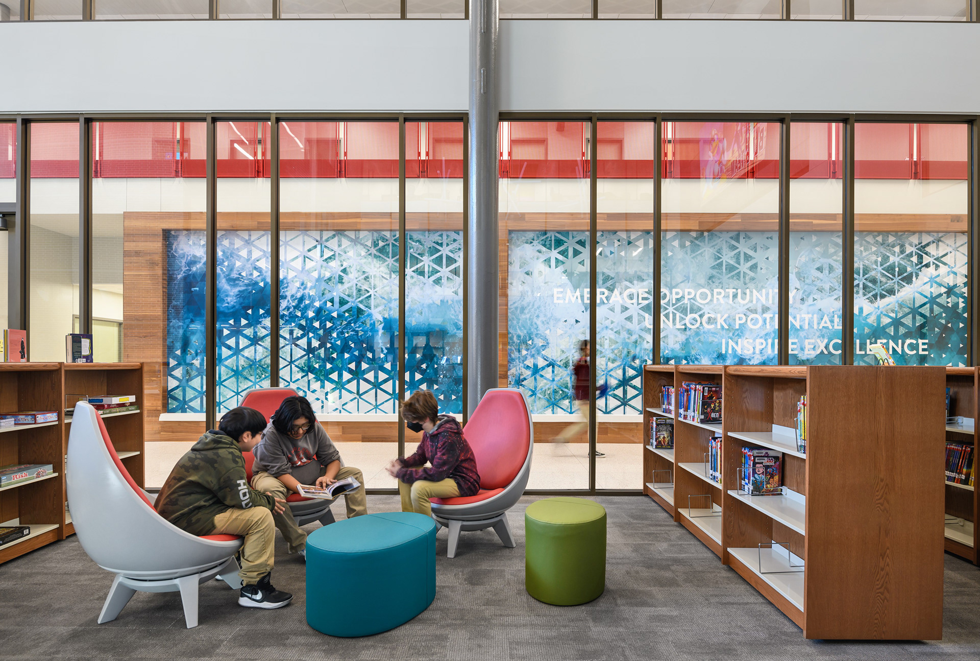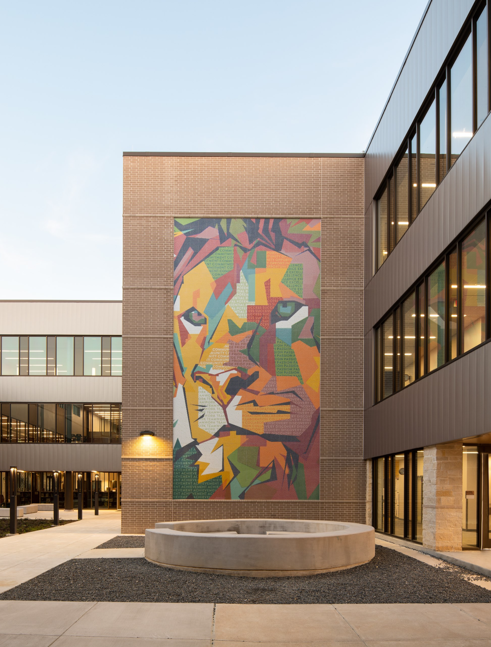Located in Houston, Texas, the Landrum Middle School was renovated by Stantec's K-12 team. As Senior Graphic Designer, I worked with the Stantec Brands & Experiences team to design large interior wall graphics that emphasized the school's values and mosaics in their outdoor courtyards based on the school's mascot.