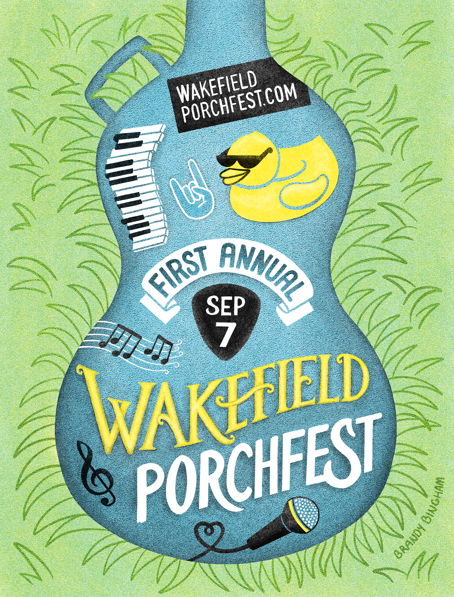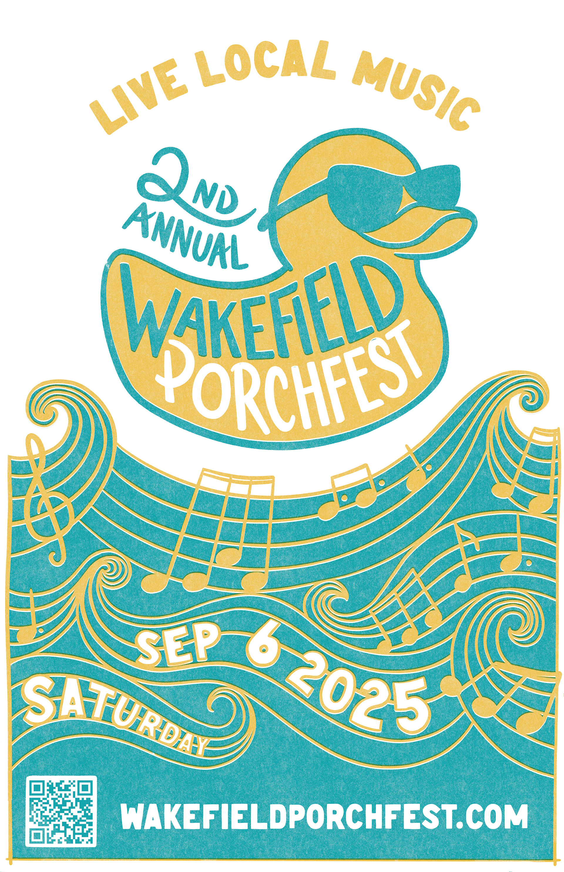 When a volunteer group in Wakefield, Massachusetts planned the town's first Porchfest in 2024, I illustrated a poster to hype it up. Inspired by Wakefield's crown jewel, Lake Quannapowitt, the poster features the beloved giant rubber duck that advertises community boating at the lake every summer. Town residents welcomed the event's return in 2025, and the duck returned as the mascot for the second poster design.